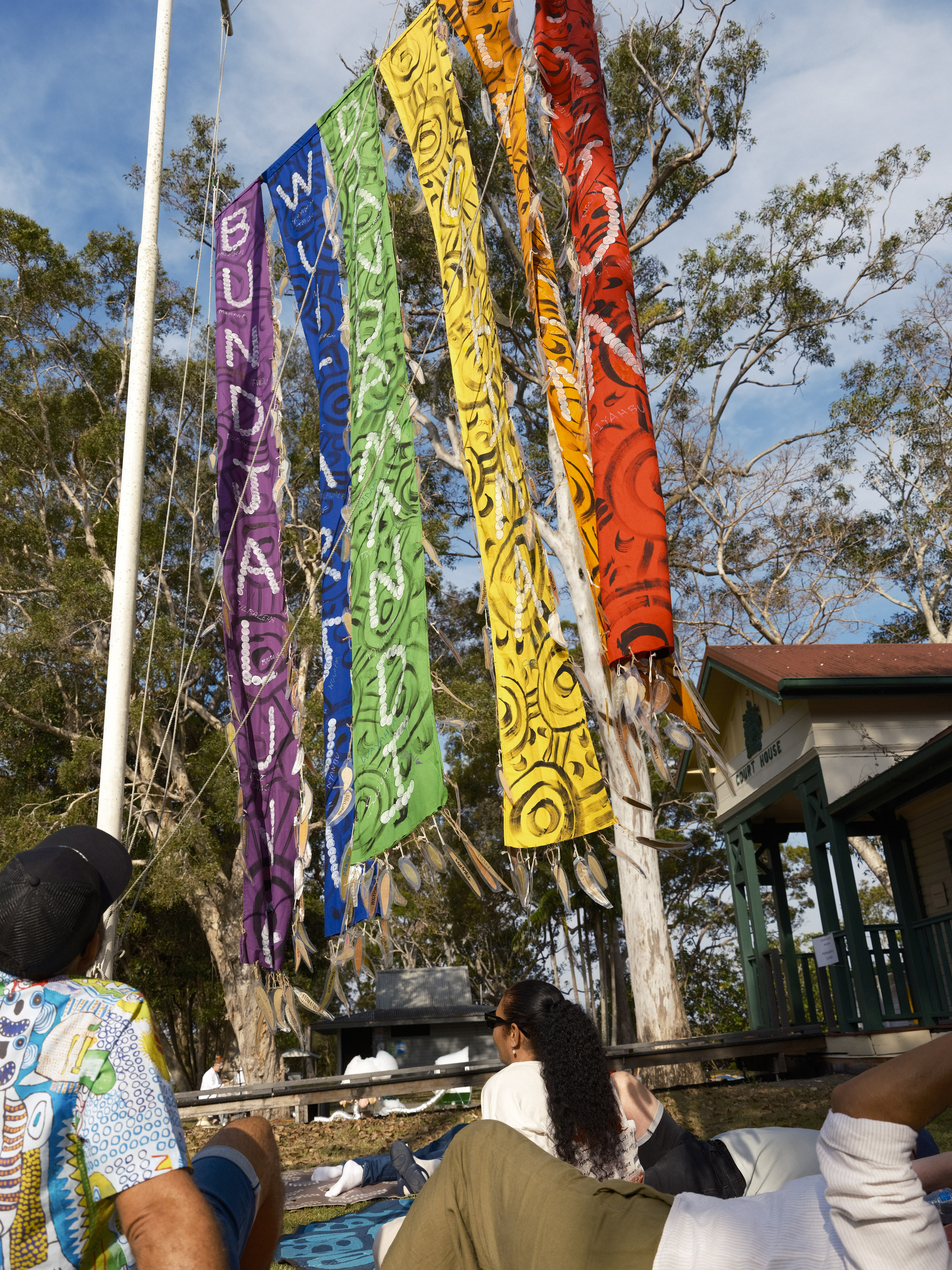 Each leaf whispers in its own tongue: Bundjalung, Wiradjuri, Gumbaynggirr, Yuin. Together, they speak of survival. The flag does not ask permission – it rises, it moves, it resists. It transforms a symbol of imposed authority into one of cultural sovereignty. Visitors are invited to lie on mats, listen to Country, and feel the wind carry stories that refuse to be forgotten. This was not just an artwork – it is a breathing act of reclamation.