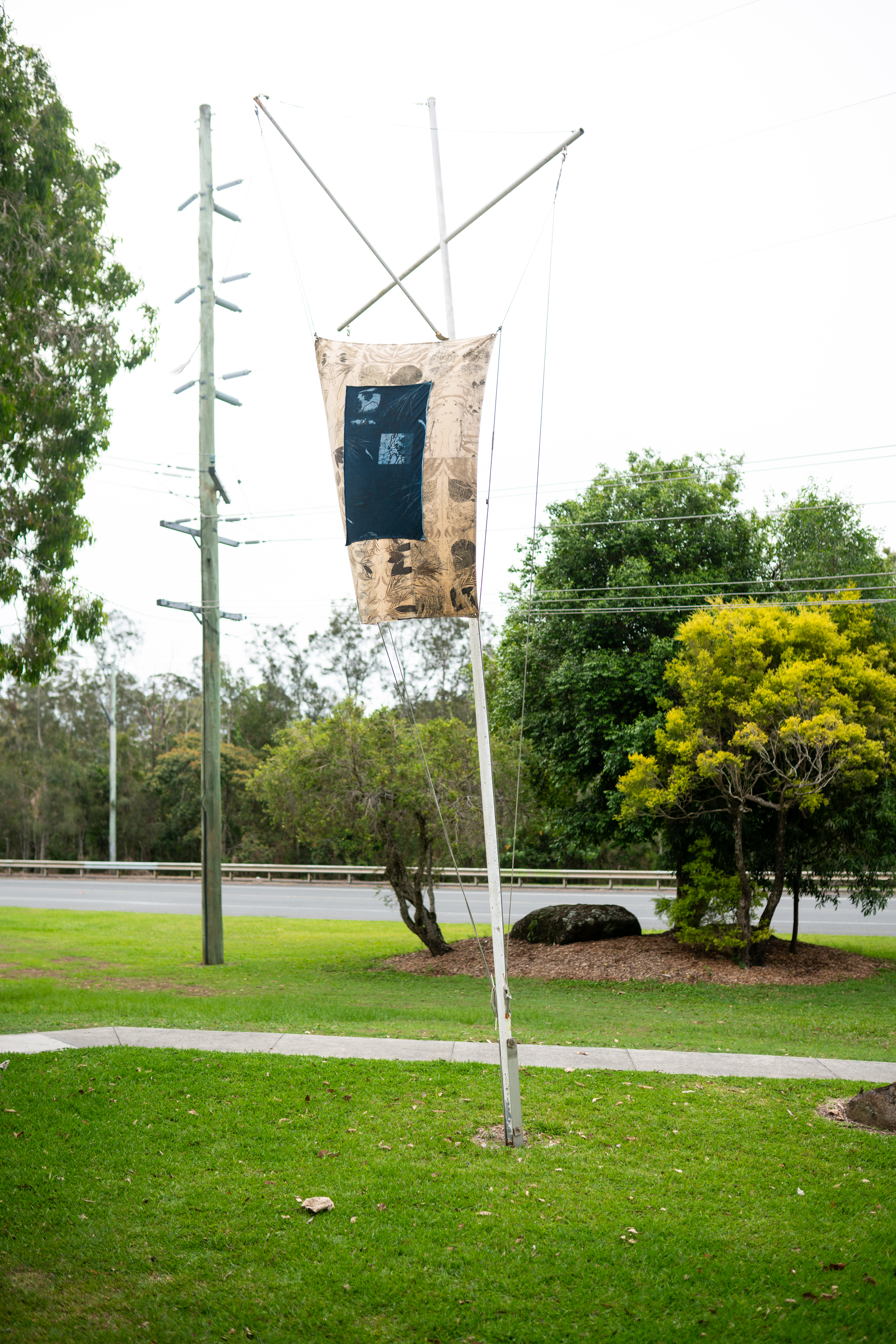 Cobaki Nature Reserve along with Cobaki Creek and Terranora Creek are heavily contaminated by PFAS chemical run off due to the proximity to the Gold Coast Airport. A local Indigenous woman who frequently ate seafood from these waterways had blood tests that showed her PFAS levels were in the top 5 per cent of results for her age. PFAS chemicals have been used in Aqueous Film-Forming Foam (AFFF) the Class B firefighting foam used to fight aviation and other chemical fires as well as within aircraft hydraulic fluid and aircraft deicing and anti-icing fluids. ‘Contamination Map: Site 1’ has been created with the help of the local Gold Coast community, helping print the quilted cotton using local Wallum plants while the cyanotype has been developed using contaminated water samples from the Cobaki Creek adjacent to the airport.